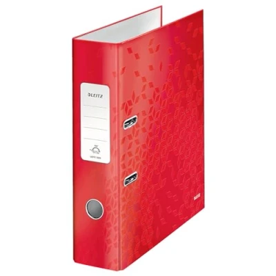 Multi-use lever arch file in metallic red, 80mm/8cm wide spine, this A4 folder holds 600 sheets (80 gsm paper), For easy handling of documents on the move and in the office Robust and sturdy grey cardboard covered with a glossy laminated paper for a high quality look and feel, FSC Certified, thumbhole for easy handling, stylish glued spine label and dual colour cover 50% wider opening and 20% quicker double sided filing thanks to the patented 180° lever arch mechanism, mechanism guaranteed for 5 years, rado rings to keep binder closed and upright on shelf Brighten up your desk with this and other products from the Leitz WOW range Contents: 1 x Leitz Lever Arch File, Red, 10050026, Dimensions (WxHxD): 80 x 318 x 285 mm, 480g, A4 folder, for Standard 2-hole punching