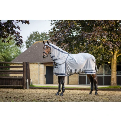 Essential defence from flies and biting insects in wet weather, this waterproof fly rug is made from durable 420 Denier Diamond Ripstop fabric.Designed with full body protection in mind, it features breathable micro-mesh with full coverage under the belly.3D mesh wither padding delivers comfort and breathability, while anti-static and anti-bacterial lining on the back, shoulders and neck prevents rubbing and enhances shine.The full neck, which secures over the ears, is detachable meaning flexibility of cover. The extra long tail flap protects the sensitive tail and dock areas.Deep shoulder gussets ensure freedom of movement in the field, and LeMieux's unique patented two-part skirt delivers a beak in tension around the rear hemline, making this an incredibly comfortable rug for your horse to wear.