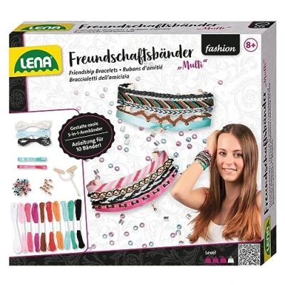Lena Complete set for making friendship bracelets, enough for 2 multi-bracelets 5 in 1 Contents: 2 satin ribbons, yarns in 8 colours, 3 wax cords, 2 clasps and a total of 140 beads in different colours and shapes With detailed colour-illustrated instructions for 10 ribbons Suitable for ages 8+ Encourages concentration, dexterity, patience and creativity, Manufacturer: Simm Spielwaren GmbH