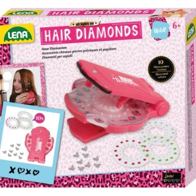 Hair Diamonds Set Set to decorate hair with sparkling gemstones and dazzling butterflies. Packed in folding box with product information. For ages 6 and up. Set includes 1 diamond clipper, 10 discs with different coloured diamonds and 10 butterflies that are glued into the hair with glue dots. With detailed, coloured instructions., Manufacturer: SiMM Spielwaren GmbH