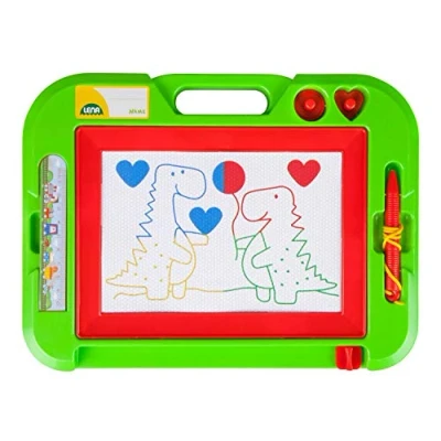 Magnetic drawing board with carry handle, pen and two stamps Drawing field is divided into four smaller fields in different colours Size: approx. 32 cm With the slider, the drawn can be erased again and again and the board can be repainted Suitable for children over 3 years, Manufacturer: SIMM Spielwaren