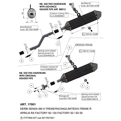 High quality genuine LeoVince replacement part OEM number: 3017001204R Set components/box contents: 3017001204, 3017001203, IMBT33X90, 410059, IMBT33X70, 206223, 410562 Attention: In addition to the spare parts, the item listing may also consist of packaging and material information. Only the items listed, the exploded drawing is for illustration purposes only Suitable for LeoVince item number: S17001
