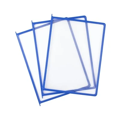Technically innovative viewing panel with PP film protruding in the corner (for easier and trouble-free insertion of documents, reducing the risk of the film coming off the frame). The sturdy, flexible and deformation-resistant plastic frame guarantees a long trouble-free use. Display A4 documents, such as photos, instructions, cards. Perfect for production facilities, offices and supermarkets. The set contains 10 blue display panels.