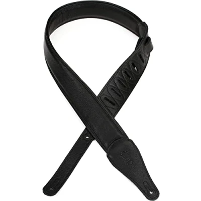 2 1/4 inch black garment leather guitar strap with colored leather ends and decorative piping, with foam padding and garment leather backing. Adjustable from 38 inches to 53 inches. Also available in extra long (xl), which adds 12 inches to overall length. Fantastic quality guitar strap Made in canada
