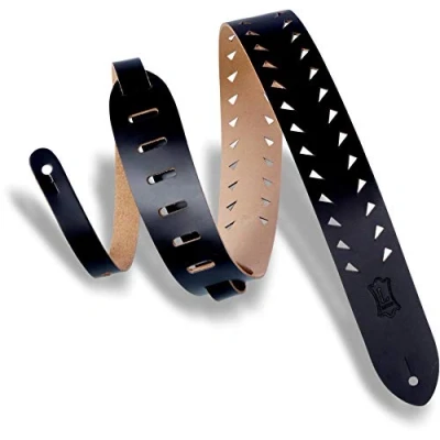 Classics Series Levy’s 2″ wide black chrome-tan leather guitar strap Adjustable to 57″ One-ply chrome-tan leather guitar strap with tiger tooth cut out pattern Designed by Levy’s industry leading fashion designers