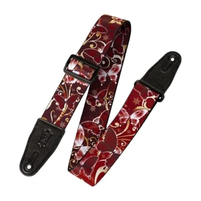 2 polyester guitar strap with Red Butterfly motif Adjustable up to 65 in length Tri-glide sliding adjustment Genuine leather ends Pin hole stitching prevents stretching Wrinkle resistant material Lightweight and easily rolled for compact storage Handcrafted in Nova Scotia, Canada