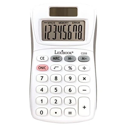Lexibook 8 Digit Calculator Basic and Memory Function Soft Silicone Keys for Office, School, Home Solar & Batteries White/Grey C208