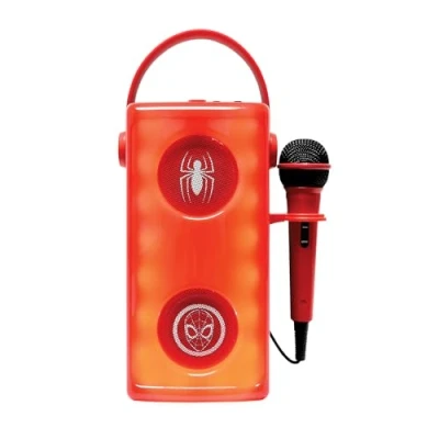 CLEAR AND POWERFUL SOUND IN BLUETOOTH - Easily stream your music via Bluetooth with this wireless speaker featuring clear, powerful sound for an unlimited music experience. MULTIPLE PLAYBACK OPTIONS - This versatile mini tower offers multiple playback options. Plug in via the 3.5mm aux-in jack, USB ports, or insert an SD/TF card up to 32GB to listen to your favorite music. SING WITH THE INCLUDED MICROPHONE - Use the included microphone to sing along to your favorite tunes, with volume and echo controls on the back of the speaker for the perfect performance. LIGHT EFFECTS AND PORTABILITY - Admire the multi-colored light effects of this mini wireless tower, which can be taken anywhere thanks to its handy handle and rechargeable 1200mAh battery. SPIDER-MAN DESIGN - Experience your best nights alongside Spider-Man, adding a playful and heroic touch that will delight all fans of the web-slinger.