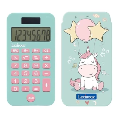 Lexibook, Unicorn, Pocket Calculator with Protective Cover, Classic and Advanced Functions, Battery Solar Powered, Blue Pink, C45UNI