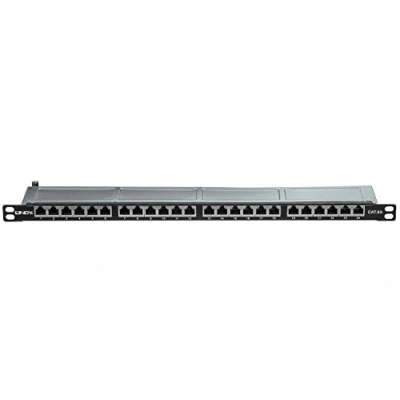 24 port patch panel, black with only half a height, Cat.6A 10 Gigabit, total shielding 360° and excellent value for money