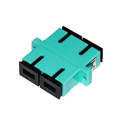 Connectors for connecting two fibre optic cables, for patch panels or fibre junction boxes. SC connector female - SC socket (duplex) UPC OM3 Class, Duplex Multimode SC/SC, Turquoise Zircon ceramic cuff, plastic case Each clutch is equipped with a dust cap to protect the toes from dust.