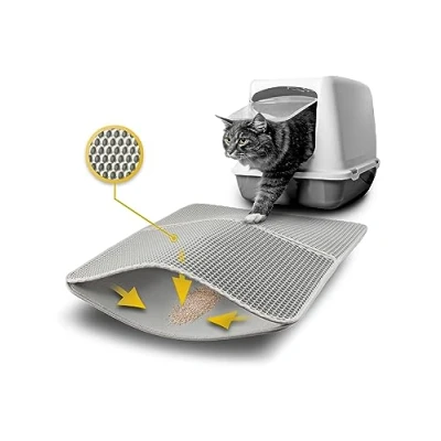 Cleanliness. The honeycomb-shaped patterned cat litter mat effectively catches litter from cat paws and litter from the box. Litter falls through dense holes that are wide and deep enough to hold large amounts of cat litter. Supports all types of cat litter such as mineral or plant fibre based clumping litter. Strong material. Made from lightweight, durable, non-toxic and environmentally friendly EVA foam rubber, this cat litter tray mat protects sensitive cat paws. The waterproof, durable base layer keeps urine off the floor and protects your wooden floors and carpets from unpleasant urine stains. The underside of the cat litter mat is equipped with a non-slip coating and prevents any slipping. Easy to clean. This litter mat is quick and easy to clean. It only takes a shake to empty the litter from the open side of the mat. If you want to clean the mat completely, simply use water to wash out. You can also vacuum the interior with a vacuum cleaner. Easy to use. Place the cat litter mat under the litter box or bowls. When your cat leaves the litter box, the litter sticking to the paws is absorbed through the permeable honeycomb holes of the mat and caught by the underside of the mat. The leak-proof layer ensures moisture protection. Various sizes and colours. You can choose between different sizes and colours.