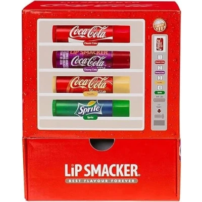 FOUR IRRESISTIBLE FLAVORS This set includes four lip balms with the flavors Coca-Cola Coca-Cola Cherry Coca-Cola Vanilla and Sprite SOFT LIPS Ideal for daily lip care each lip balm provides deep hydration and leaves your lips soft shiny and protected suitable if you’re looking for a lip balm for dry cracked lips LIP SHINE Add a touch of color and a soft kissable finish to your lips with Lip Smacker Coca Cola a slightely tinted lip balm that combines the care of a natural lip balm for everyday use GIFT SET The Coca-Cola dispenser-shaped pack makes this kids lip balm set the perfect gift to surprise girls and collectors always handy for stylish lips SMILES ACROSS THE GLOBE: Since 1973, Lip Smacker has been bringing smiles to children's lips worldwide. Our genuine flavors, scents, and colorful designs can be mixed to create joyful moments that soften lips into a tender smile