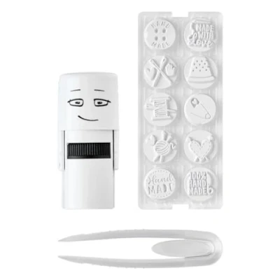 12-piece stamp set with stamp, 10 interchangeable motifs on the theme of handmade and transparent tweezers for replacing the stamp plates Diameter of the stamp: approx. 1.8 cm. Height: approx. 6.5 cm, includes ink pad with grey stamp ink, ink spreads evenly for a clean stamping result Stamp ink is water-based, acid-free, non-toxic and protected from drying out, 100% made in Germany A practical helper in everyday life, for crafting, decorating and decorating cards, albums, diaries, bullet journals, collages, gift tags, scrap-booking, cardmaking, DIY projects and many other creative activities For custom crafts and stamps on fabric, clothing, paper, cards, school books, posters, calendars, wood and much more