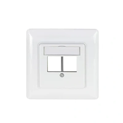 Junction box for 2 keystone modules, design compatible, straight outlet, suitable for USB, HDMI, LWL or RJ45 Complete set: frame, central plate and support ring - 50 x 50 mm central plate with dust protection flap 80 x 80 mm outer frame – UAE carrying ring made of metal Colour: similar to RAL 9003 signal white Suitable for flush-mounted, surface-mounted and parapet channel