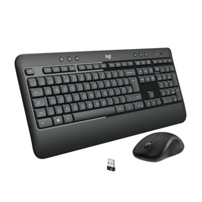 Typing Accuracy: Familiar experience, typing with ease and comfort on this full-size wireless keyboard, noise cancelling, wrist rest, splash proof(1), adjustable Designed for comfort: The wireless mouse combo with ambidextrous shape and rubber side grip that fits your palm and slider perfectly tracked and precise Long Battery Life: The wireless keyboard and mouse set comes with a long battery life, with keyboard that can last up to 36 months and wireless mouse up to 18 months (3) Customizable control: Improve productivity at your fingertips, keyboard designed convenient and essential shortcuts for direct media access, calculator and battery verification Wireless freedom: Plug and play your keyboard and mouse with the Logitech Unifying mini USB receiver, for a reliable wireless connection up to 10 m from your PC or laptop (2) Compatibility: This Logitech keyboard mouse combo is compatible with Windows 10 or newer, Windows 8, Windows 7, Chrome OS Upgrade to Logitech MK850 Combo: Improve Productivity with the MK850 Multidispositf Combo Keyboard & Mouse, Bluetooth/USB, Wrist Rest, Sculpted Mouse, Ultra-Fast Scrolling