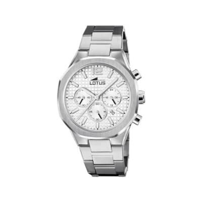 The stylish chronograph for men from the Lotus brand is a real eye-catcher and can be worn with any outfit The high-quality grey silver stainless steel bracelet with the button flap fits comfortably on the wrist The silver-coloured dial with the silver-coloured hands is protected by high-quality mineral glass The 11.15 mm thick silver-coloured stainless steel case has a diameter of 41.8 mm The watch has a water resistance of 5 bar (suitable for everyday use such as B. bathing, showering or washing hands)