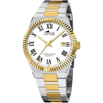 Men's quartz hour and minute watch. Round stainless steel case, multi color. Stainless steel bracelet, multi color, with double push button closure. Round dial in white mineral glass. Water resistance: 10 atm.