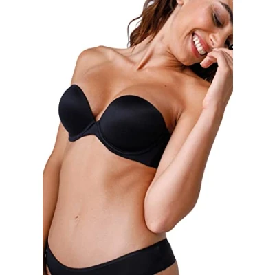 Push-up bra with removable straps and deep neckline No silicone; Suede inner band to ensure tightness even without straps; The alternative innovation to silicone bands to avoid discomfort and irritation; Super soft and shiny microfiber Crossable, neck and removable shoulder straps; Padded eyelet hook for optimal comfort Body Bliss: accomplice of your beauty