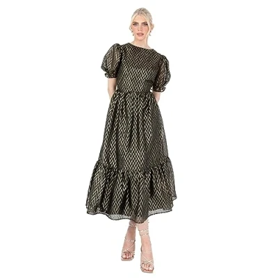 Lovedrobe Women's Midaxi Dress Ladies Round Neck Short Puff Sleeves Metallic Zig zag Tie Back A line for Party Evening Occasion, Black, 14