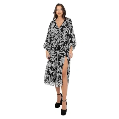 Lovedrobe Women's Midi Dress Ladies V Neck Long Balloon Sleeve Faux wrap Thigh Split Shirred Waist Tassel Belt A line Smart Casual, Black, 8