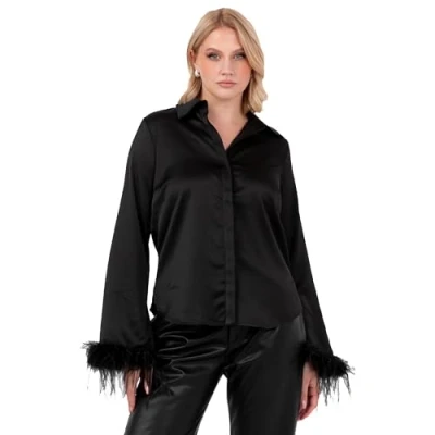 Satin Shirts for Women: Lovedrobe presents stunning long sleeve satin shirts for women, with feather trim. Available in three colours: Black, White or Fuchsia Pink, and in 10 UK/EU sizes: 8 UK (36 EU), 10 UK (38 EU), 12 UK (40 EU), 14 UK (42 EU), 16 UK (44 EU), 18 UK (46 EU), 20 UK (48 EU), 22 UK (50 EU), 24 UK (52 EU), 26 UK (54 EU). Ladies' Blouses and Shirts: The women's shirt features long sleeves and a classic point collar, with button-up front fastening. Crafted from a sleek satin fabric, a luxe feather embellishment on the cuffs takes this women's blouse from office wear to party piece. Smart-casual Shirts for Women: Feel comfortable in any situation in this smart-casual shirt from Lovedrobe. The flowy satin fabric and long sleeves allow for free and easy movement. Whether sitting down or having a dance, you will always feel cosy and relaxed. Fabric Composition: Crafted from 100% Polyester, the smart-casual women's satin blouse offers the perfect blend of style and comfort. Going Out Tops for Women: From office wear to post-work drinks, cocktails to formal evenings, this versatile day-to-night women's top is a standout choice for various occasions. The perfect blend of smart and casual, this exquisite long sleeved blouse effortlessly transitions from workwear to a night out, ensuring elegance in every moment. Just pair with jeans for the ultimate smart-casual outfit.