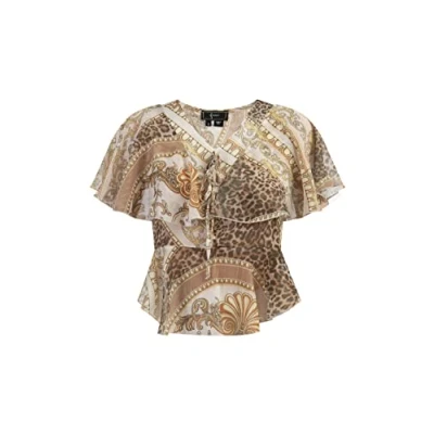 Silky shiny shirt blouse Delicate, semi-transparent material Print with gold metallic threads Renaissance Animal Print V-neck with tie band
