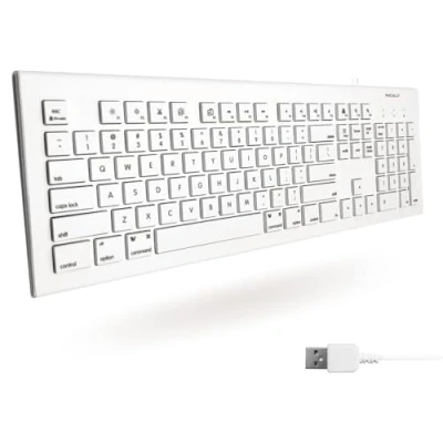 Budget replacement for Apple keyboard Full size keyboard (104 keys) with numeric keypad 15 Apple specific shortcut keys (Cut/Copy/Paste, iTunes Control, Volume Up/Down, etc) and multimedia shortcut keys for Windows PCs. No drivers required. Low-profile keys give you a quiet, comfortable typing experience Simply plug into a USB port and never worry about changing batteries again