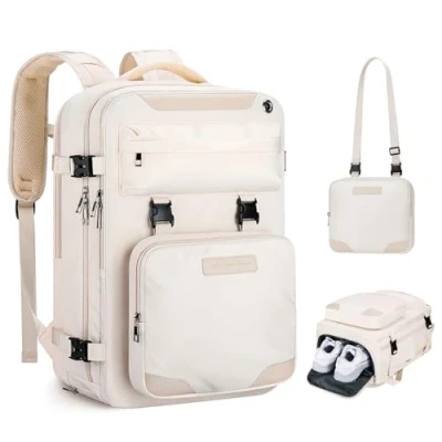 Versatile Shoe Compartment: This travel backpack features a dedicated shoe compartment, keeping your shoes separate and organized. Its breathable design ensures freshness and easy cleaning, making it an ideal choice for a travel backpack or hiking backpack. Enhanced Device Protection: Safeguard your laptop or iPad during travel with the padded compartment in this laptop backpack. It provides reliable protection against bumps and scratches, ensuring the safety of your devices. Airline Approved: Our carry on backpack for airplanes meets airline standards and fits perfectly both under the seat in front of you and in the overhead storage compartment, offering ample space to store all your travel essentials while ensuring it remains compact and lightweight for easy maneuverability. Convenient Travel Features: Enjoy hands-free transportation with the luggage belt that securely attaches the backpack to your carry-on luggage. This lightweight carry on backpack is designed for easy travel and also includes a back anti-theft pocket to keep your valuables safe and secure.The elasticated side pocket of this versatile backpack securely holds water bottles, umbrellas, and other travel essentials. Detachable Crossbody Bag: This waterproof laptop backpack women effortlessly transitions to a stylish crossbody bag, making it suitable for various occasions. Its versatile design caters to different needs and preferences.When using as a crossbody bag, take the interlayper out of the back zipper pocket and attach it to Velcro hook to avoid rubbing clothing.
