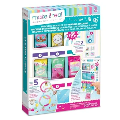 Snack-Inspired Jewelry Fun: Immerse yourself in a delightful crafting experience with the Make It Real Bracelet Snackers Vending Machine, combining the joy of snacking with the creativity of bracelet making. Vending Machine Dispenser: The kit features a charming vending machine that dispenses snack-themed bags, adding a playful and interactive element to the crafting process. Create 5 Snack-Themed Bracelets: Craft a variety of stylish bracelets inspired by popular snacks, allowing you to wear your favorite treats as fashionable accessories. Easy-to-Follow Instructions: Follow the step-by-step instructions provided in the kit for hassle-free crafting, making it accessible for both beginners and experienced jewelry makers. Interactive and Entertaining: Enjoy an interactive and entertaining crafting session as you dispense snack bags from the vending machine and create deliciously cute bracelets., Manufacturer: Make It Real