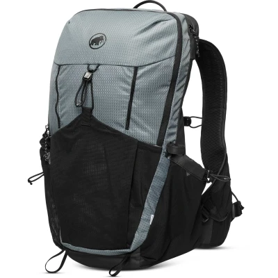 The Mammut Ducan 26 combines lightweight comfort with on-the-go access during long days on the trail. The reworked, ventilated back system combines maximum airflow with strategic padding for a barely-there feel. A quick-access front mesh pocket and side water bottle pockets keep essentials within reach while the integrated, detachable rain cover shields your gear from wet weather. Weight: 920 gVolume: 22LDimensions: 19 × 52 × 23 cm