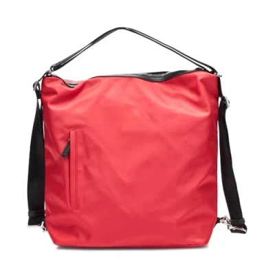 Shining nylon shoulder bag with faux leather details, convertible into a backpack with a simple hand gesture. Functional and lightweight with a sporty-chic look. Front and back zipped outer pockets. Custom interior with multiple pockets, metal accessories, custom pullers and metal lettering logo.