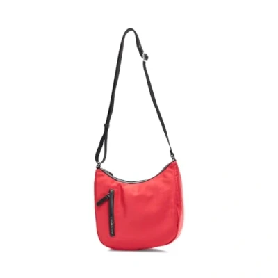 Medium size shoulder bag with pocket both front and back, in shiny nylon with adjustable ribbon shoulder strap embellished with shiny metallic details.
