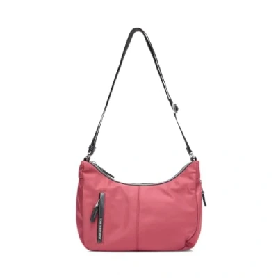 Shiny nylon shoulder bag with faux leather details, small size. Functional and lightweight with a sporty-chic look. Front and back zipped outer pockets. Individual interior with multiple pockets. Metal accessories, custom pullers and metal lettering logo.