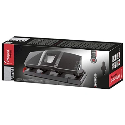 Four hole metal hole punch with paper guide Patented hole punch system for quick accurate hole punching using the rings of a binder Enhanced sheet blocking system, Front emptying confetti trap Metallic grey finish 25 / 30 sheet capacity