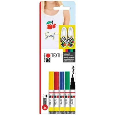 NEW LIFE - Spruce up your old clothes, new textiles or bland materials with these textile painter pens ACCURATE - Achieve more precision with the pen compared to the Textil paint 1-2MM TIP - Helps you create more intricate designs with maximum detail LIGHT-FAST - Washable at up to 60C after iron fixing or oven fixing INCLUDES - Contents: 5 x Textil Painter 1-2 mm (Yellow 019, Cherry Red 031, Dark Blue 053, Rich Green 067, Black 073)