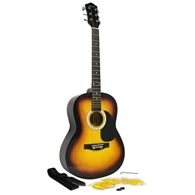 Acoustic Guitar: The Martin Smith W100 acoustic guitar has a dreadnought ergonomic body that is made for playability and is finished in a high gloss Steel Guitar Strings: Designed to remain in tune for longer once they have settled, the steel guitar strings on this guitar will generate a loud and warm tone Metal Gearheads: Making tuning more easier and more precise, the metal gearheads on this acoustic guitar are more durable than their plastic counterparts Accessories: This acoustic guitar kit comes with an adjustable guitar strap and guitar plectrums Spare Guitar Strings: Protecting you from inevitable breakages, this guitar pack includes a spare set of strings