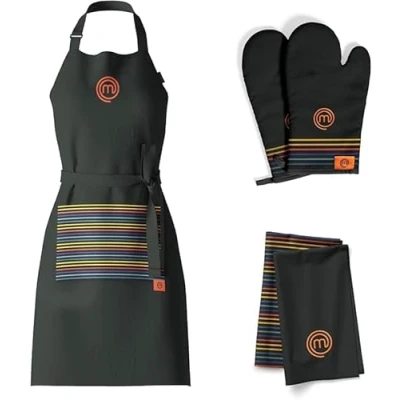 OFFICIAL MASTERCHEF PRODUCT - This high quality cotton kitchen textile set is an official product of the MasterChef TV series, designed in the UK. Heat and fire resistant material – each element is made of high-quality cotton, is durable and heat-resistant up to 250 °C. Embroidered details – Each piece in this set is embroidered with the official MasterChef logo and equipped with branded loops for convenient hanging in your kitchen. Easy to clean – all components of the gift set are made from 100% cotton and are machine washable at 40°C, which makes cleaning super easy for everyday use. Vivid rainbow design – the rainbow pinstripe design is perfect for eclectic homes or those who want to add a pinch of personality to their kitchen.