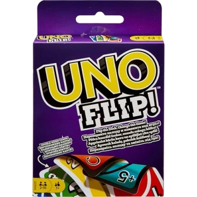 UNO FLIP! Gives the well-known card game a new twist The deck printed on both sides and the special flip card make this classic card game even more exciting If the special FLIP card is played, all cards in the player's hand, even on the discard pile, can be turned over. So they show completely new numbers and colours! UNO FLIP; includes fun new action cards, such as "Pull 5" or "Expose All" If a player has only one card left, he must call "UNO" Contains 112 cards and game rules; ideal for the whole family and players aged 7 and up, Manufacturer: Mattel