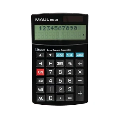 123inkThe Maul MTL 600 is a desktop calculator with commercial calculation functions such as tax calculation (price with/without tax key), profit margin calculation, profit-cost-margin calculation and a percent key. The Expense and Profit Cost Margin keys have a signal colour, making them easier to find. The calculator is equipped with a rounded and therefore more legible 2-line LCD display. The calculation method is also displayed here. The MTL 600 is battery and solar powered. If you leave the calculator on without using it, it will automatically turn off. It has a size of 103mm x 170mm (LxW).