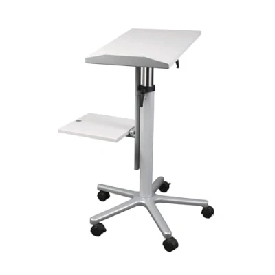 Speaker stand and beamer cart in one. For presenters who change frequently: the two panels are continuously adjustable in parallel in height Smooth lowering of the support surface thanks to Airpolster technology: no annoying oscillations The magnetic attachment allows the side board to be folded for a tight footprint.