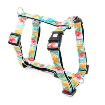 High quality: The lightweight harness is made of soft, hypoallergenic and quick-drying neoprene with extra padding for a comfortable grip and extremely tear-resistant polyester with precise and cool print. The metal parts are made of solid, solid, brushed material Safe: the 2 power humps, our mega-strong click fasteners, hold 5 times the dog's weight. Thanks to the extra D-ring at the front of the neck, the dog can be better guided if necessary Practical and comfortable: it does not chafe on the front rails and thus provides maximum freedom of movement for your pet. Flexible: the harness is suitable for most dog breeds, as it can be individually adjusted thanks to the shape and four controls for the perfect size adjustment Clean: so that the crockery can look like new even after a trip in bad weather, it is machine washable at 30 °C