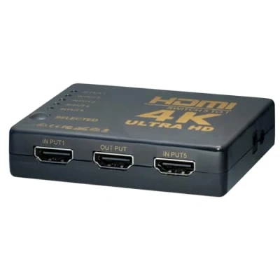 5 inputs, 1 output · Multiple switching methods: IR remote or at the touch of a button · Supports 4K (2160P@30Hz), 3D and Full HD (1080p) · Compatible with uncompressed audio formats such as LPCM Switches 5 different sources on your monitor using the IR remote control This text has been translated by a machine