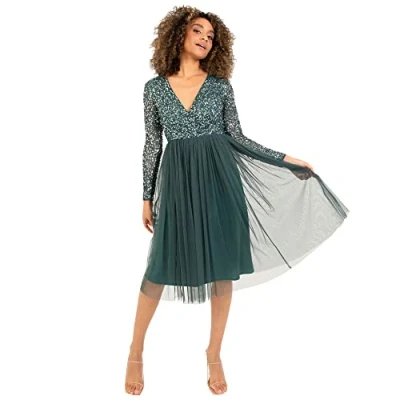 EMBELLISHED DRESSES FOR WOMEN- Presenting adorable sequin finished long sleeve dresses. Available in 12 UK sizes- 6, 8, 10, 12, 14, 16, 18, 20, 22, 24, 26, 28 and a range of colours: Blue, Sage, Bottle Green, Grey, Burgundy, Dusty Pink, Beige, Pale Mauve. Choose a favourite one for yourself and your bridesmaids. MIDI EVENING DRESS- Features a chic V neckline and a floor sweeping soft tulle skirt that flairs from the waist giving the dress a romantic finish. This dress for women has a shimmery, hand sewn sequin embellishment, making you feel like a star. The evening gown is finished with an exposed zipper. A-SHAPE DRESS FOR LADIES- Feel comfortable in any situation in the A line cut and empire waist. The loose bottom of the dress will make your moves easy to make. Doesn’t matter if you are dancing or sitting, you will always feel cosy and relaxed. A-shape and high waist will highlight your curves and will look great on all body types: petite, regular or plus size. MATERIAL COMPOSITION- This cocktail ladies dress is made from 100% polyester with midi length tulle overlay. The top is decorated with hand sewn sequins that are beautifully shining and give you a romantic vibe. ONE DRESS, DIFFERENT OCCASIONS- This ball gown will be perfect for various occasions. Doesn’t matter if you are a wedding guest, maid of honour, or looking for a dress for graduation, sixth-grade prom, formal evening parties, communions, christening, or simply a maternity photography shoot.