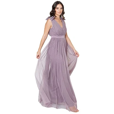 WEDDING DRESSES FOR WOMEN- Presenting adorable sequin finished sleeveless dresses. Available in 12 UK sizes- 6, 8, 10, 12, 14, 16, 18, 20, 22, 24, 26, 28 and a range of colours Blue, Sage, Bottle Green, Grey, Burgundy, Pink, Beige, Emerald Green, Lilac. Choose a favourite one for yourself and your bridesmaids. MAXI EVENING DRESS- Features a chic V neckline and a floor sweeping soft tulle skirt that flairs from the waist giving the dress a romantic finish. This dress for women has beautifully finnished ruffle shoulders. The evening gown is finished with an invisible zipper. A-SHAPE DRESS FOR LADIES- Feel comfortable in any situation in the A line cut and empire waist. The loose bottom of the dress will make your moves easy to make. Doesn t matter if you are dancing or sitting, you will always feel cosy and relaxed. A-shape and high waist will highlight your curves and will look great on all body types petite, regular or plus size. MATERIAL COMPOSITION- This cocktail ladies dress is made from 100% polyester with maxi length tulle overlay. This womens dress is decorated with a satin belt, adding romatic style. ONE DRESS, DIFFERENT OCCASIONS- This ball gown will be perfect for various occasions. Doesn t matter, if you are a wedding guest, maid of honour or you are looking for a dress for graduation, sixth-grade prom or formal evening parties, communions, christening or simply a maternity photography shoot.