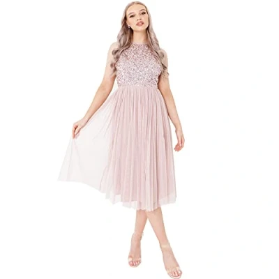 Maya Deluxe Women's Ladies Midi Dress with Halter Neck Tulle for Evening Graduation Prom Wedding Bridesmaids Ball Gown, Frosted Pink, 24
