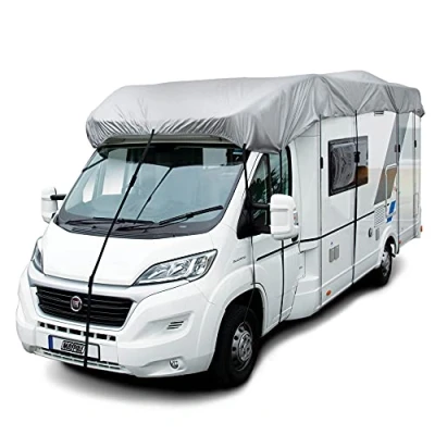 A quick and easy to fit cover to protect your motorhome against: frost, snow, smog, dust, rain, wind, UV rays, leaves and birds Durable, water-repellent polyester material with high UV protection 18 adjustable straps with nylon-coated steel hooks for secure hold Non-abrasive padded protection prevents scratches or damage to the bodywork Elasticated front for a tailored fit