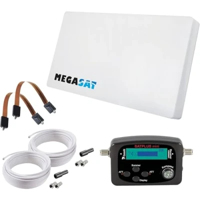 Megasat Flat Antenna Set D2 Profi Line (2 Users, Including 2 x 10 m Cable, Satfinder, Window Grommet, Interchangeable LNB, Many Mounting Options) White