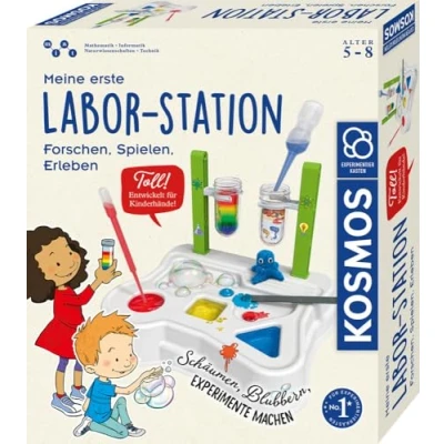 Research, wonder, glibber and bubbling: this laboratory station from KOSMOS makes even the smallest desire for science with its exciting experiments. The experimental equipment specially adapted for children ensures a real laboratory feeling and introduces small researchers to exciting phenomena. In addition to pipette, tweezers, spatulas and test tubes, the set also includes alginate powder and colour tablets as well as colourful stickers to decorate the station. Clear and easy to understand, the small slime figure Quello explains what happens in the individual experiments and guides through the experiments. The extensive experiment box My First Laboratory Station is the ideal introduction to the world of science for children aged five and over., Manufacturer: KOSMOS