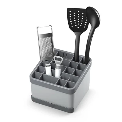 Customizable: Create your own configuration according to needs You can adjust the number of gaps up to a maximum of 25. Features a convenient dual-use sliding bottom drawer: works as a utensil rest to keep the countertop clean while cooking or as a handy stand for mobile or tablet Upward design: first row for shorter utensils, last for longer ones Max capacity: 50 pieces Measurements: 15x15x11cm, Weight: 1.0141264052 pounds, Manufacturer: Metaltex
